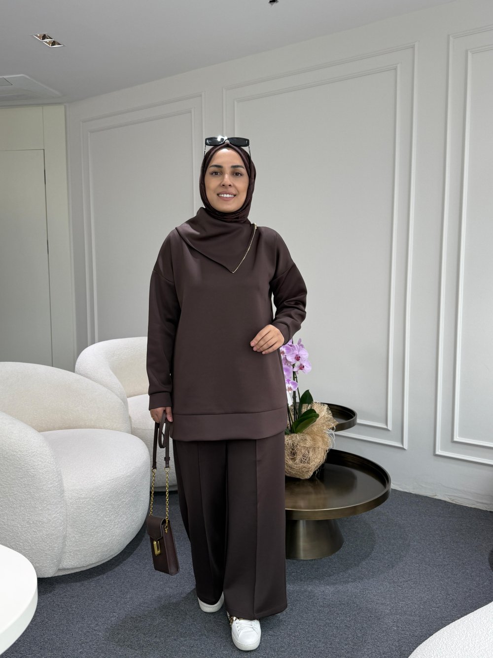 Asimetrik Yaka Scuba Takım Kahverengi