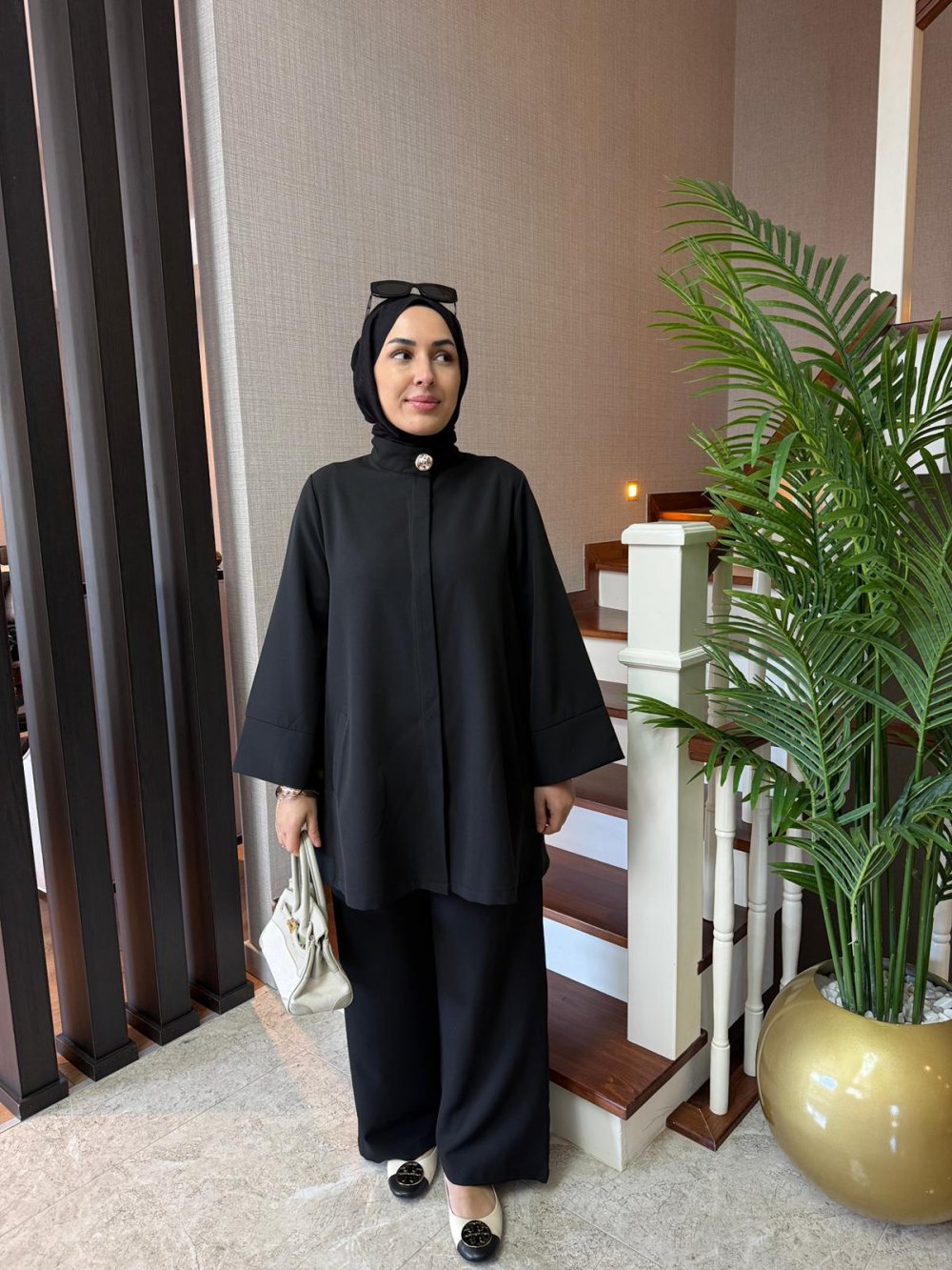 Tunik önden gizli düğmelidir, boynunda gold düğme detayı ve yanlarda cepleri bulunmaktadır.