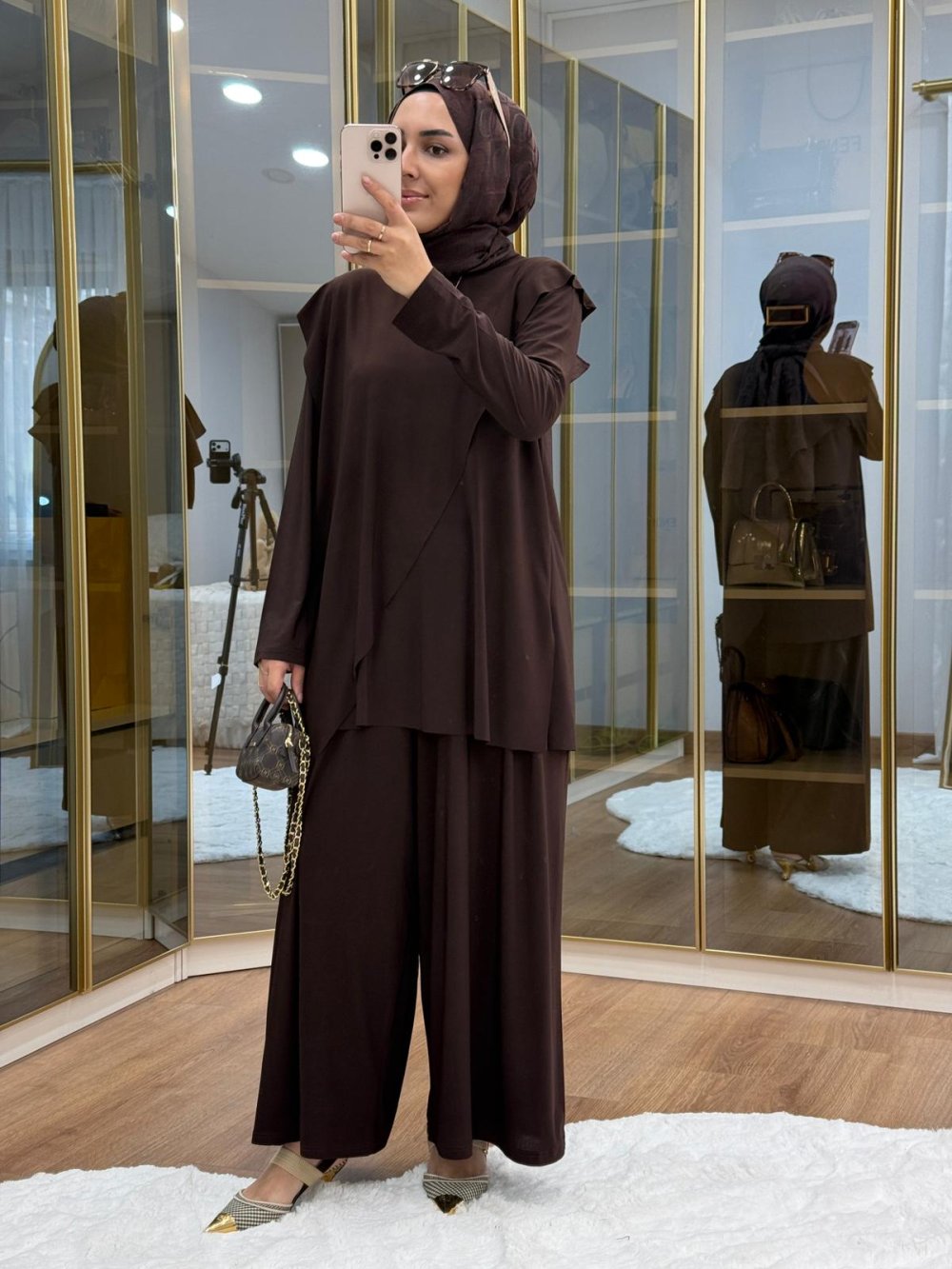 Çapraz Şal Detaylı Tilda Kumaş Takım Kahverengi