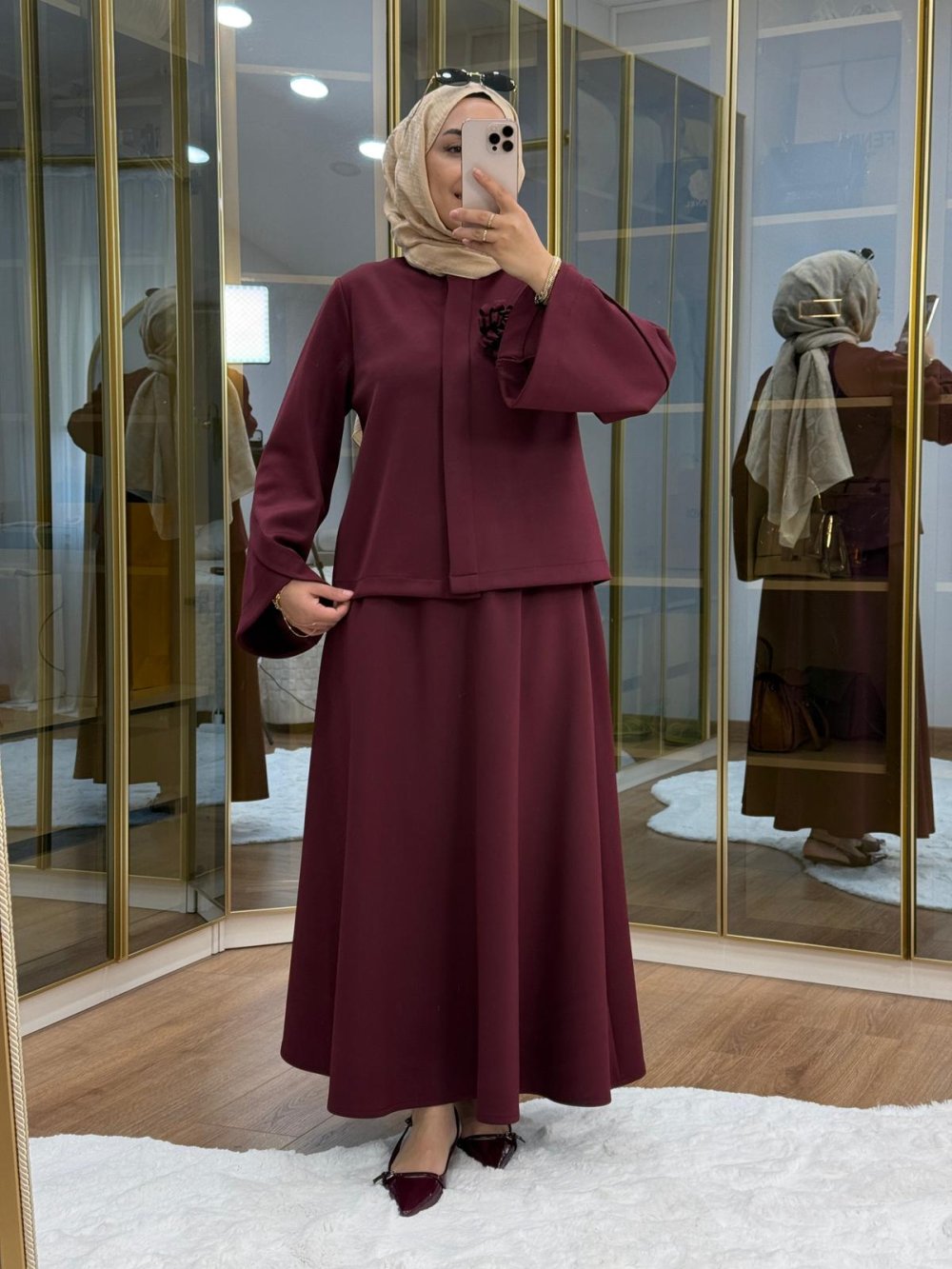 Çiçek Broş Detaylı Scuba Etekli Takım Bordo