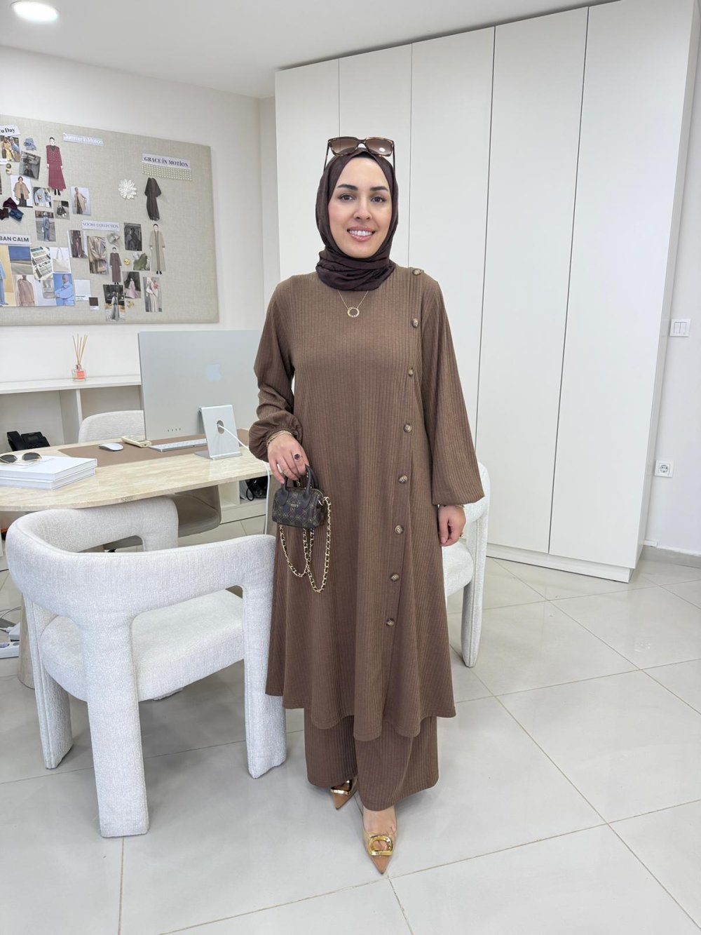 Tunik boy 120 cm’dir. Sol tarafında çubuk düğme detayı, bileklerinde lastik bulunmaktadır.