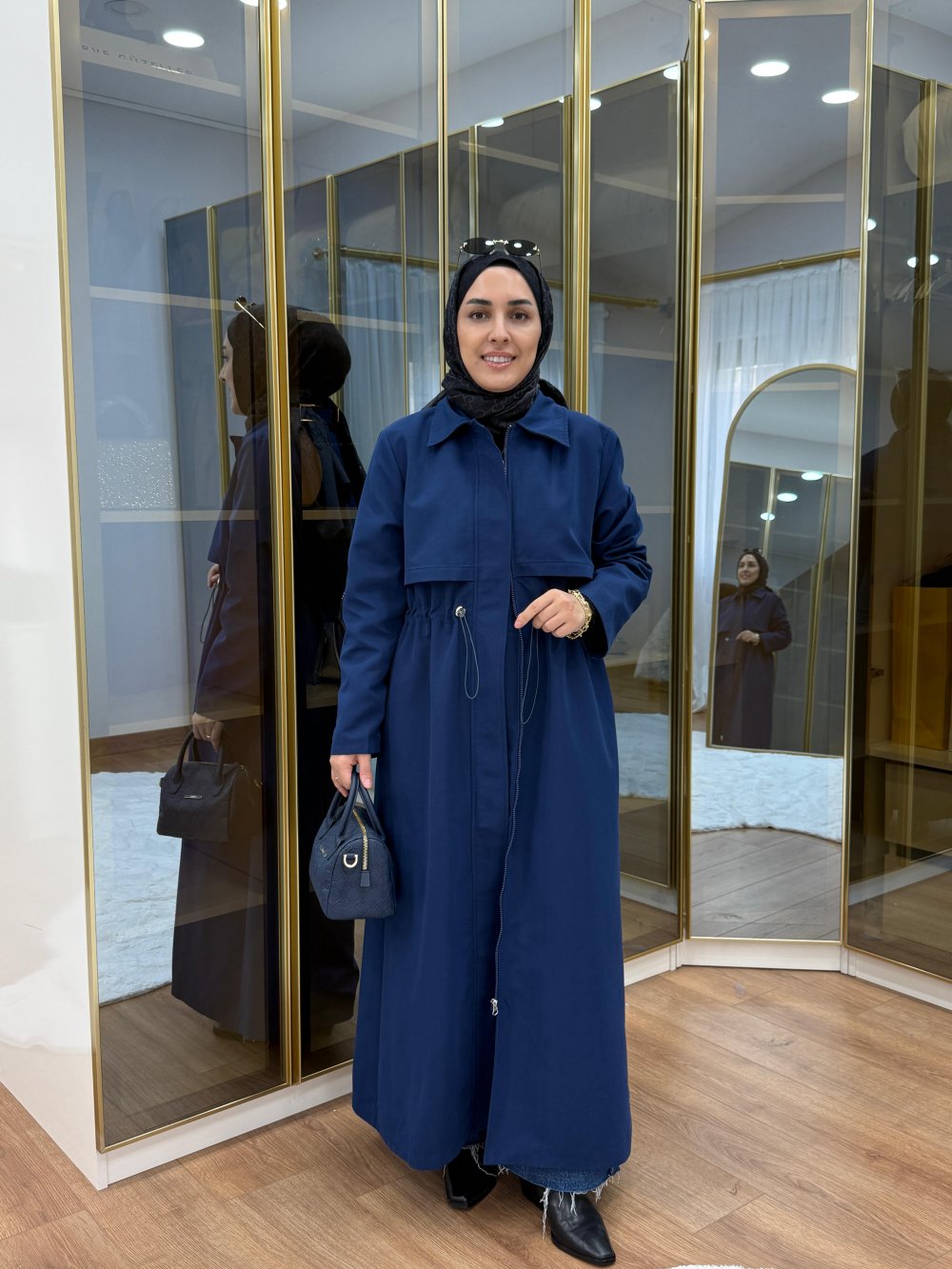 Fermuar Detaylı Maksi Boy Trençkot Lacivert