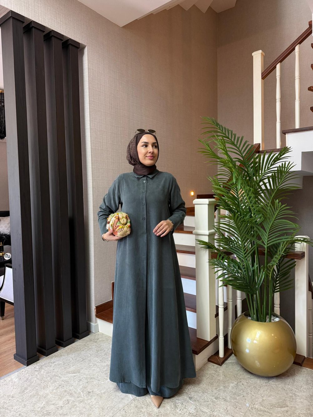 Tunik boy 138 cm’dir. Önde düğme ve yırtmaç detayı mevcuttur.