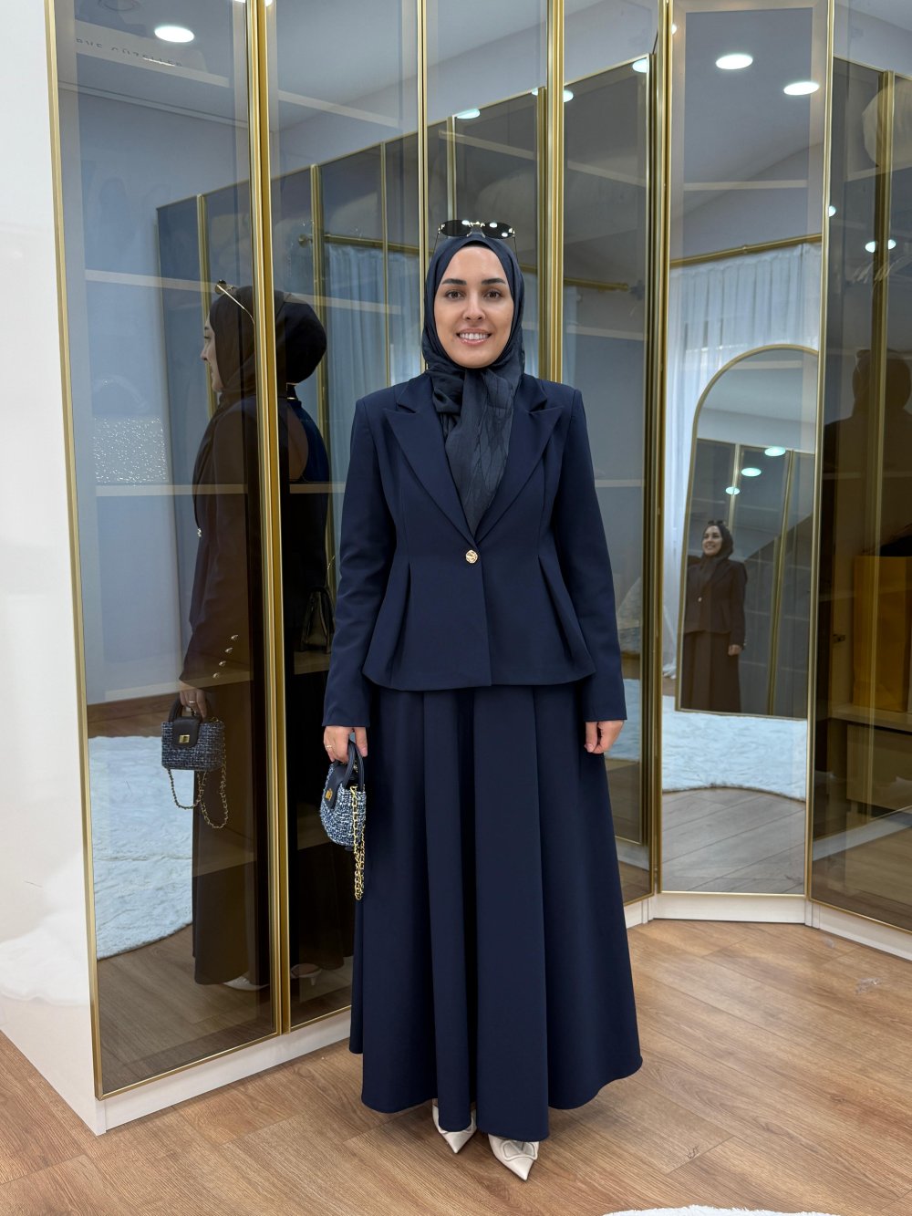 Pile Detaylı Ceket Etekli Takım Lacivert