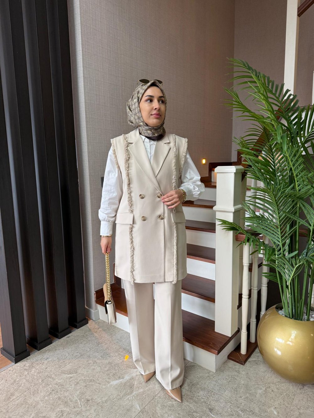 Püskül Detay Yelek Takım Bej