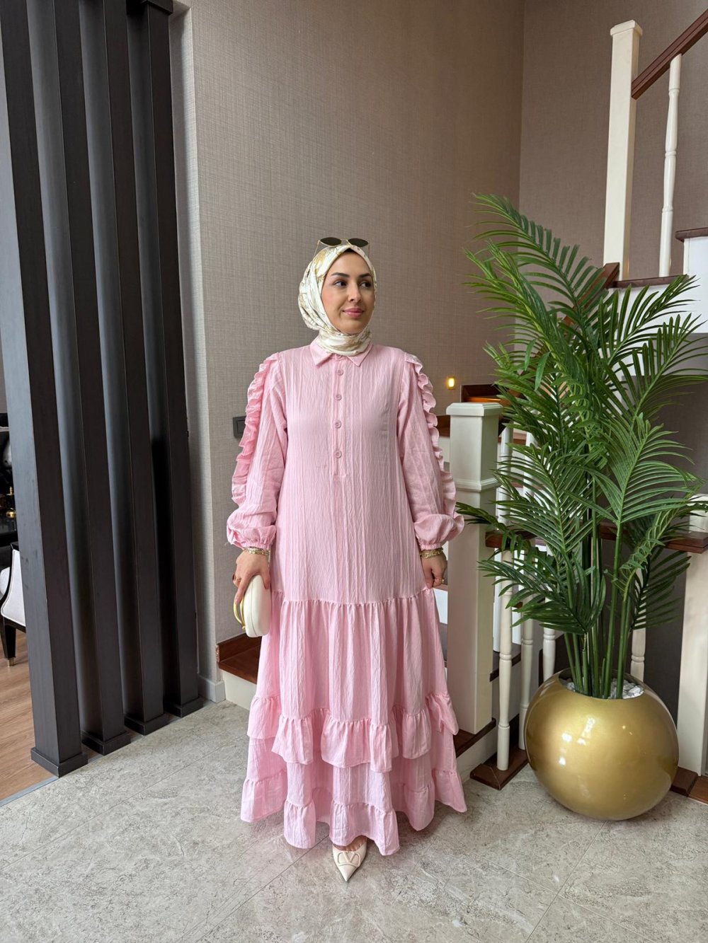 Seyyar kuşağı mevcuttur. Kollarında fırfır, etek uçlarında kat kat detayları bulunmaktadır. Kol uçları lastiklidir.