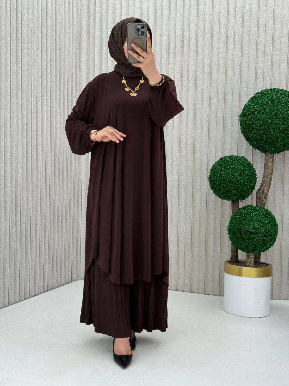 Suzan Piliseli Pantolonlu Takım Kahverengi