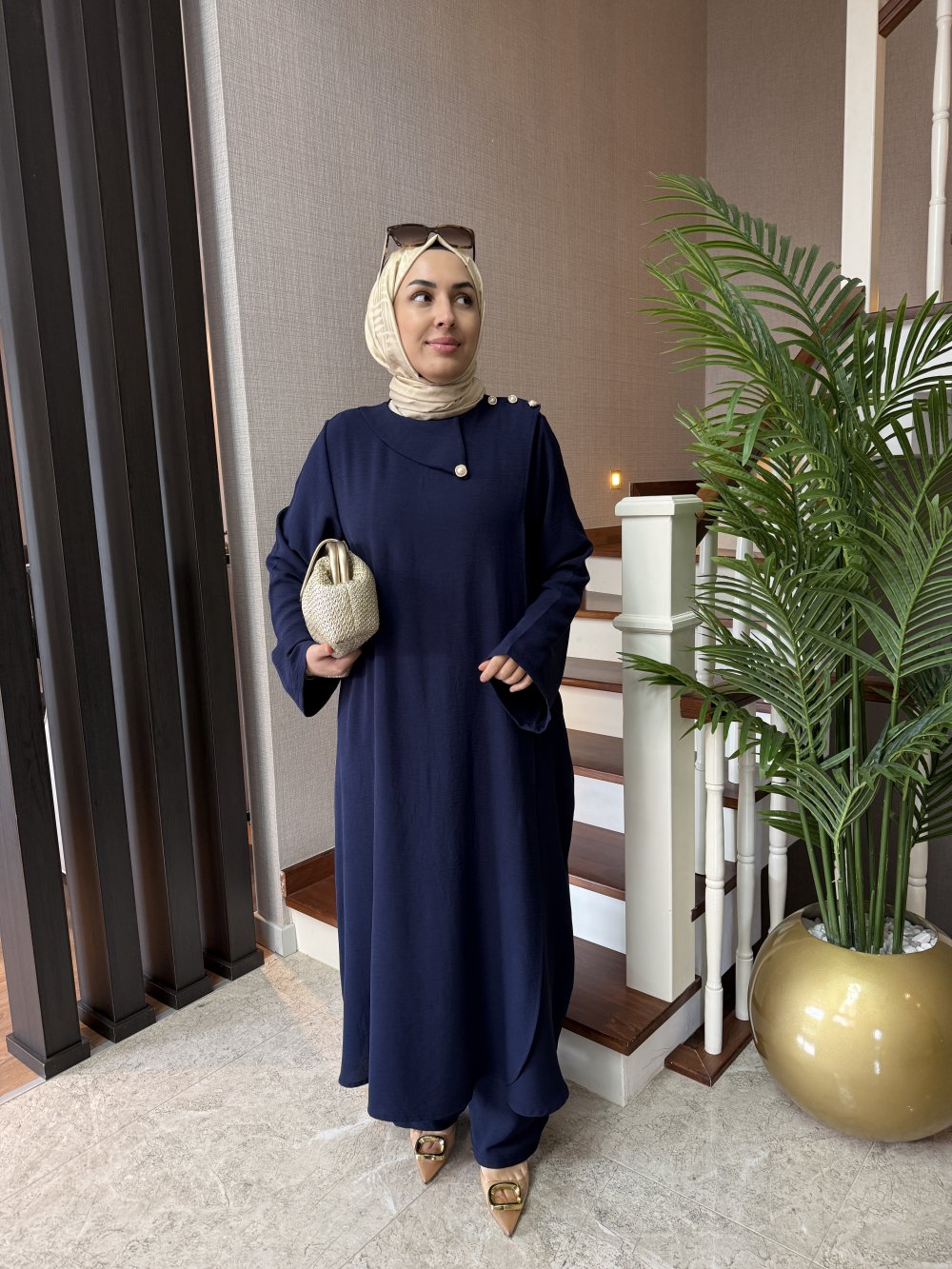 Tunik boy 125 cm’dir. Kruvaze kapama şeklinde gelmektedir, omuzunda düğme detayları mevcuttur.