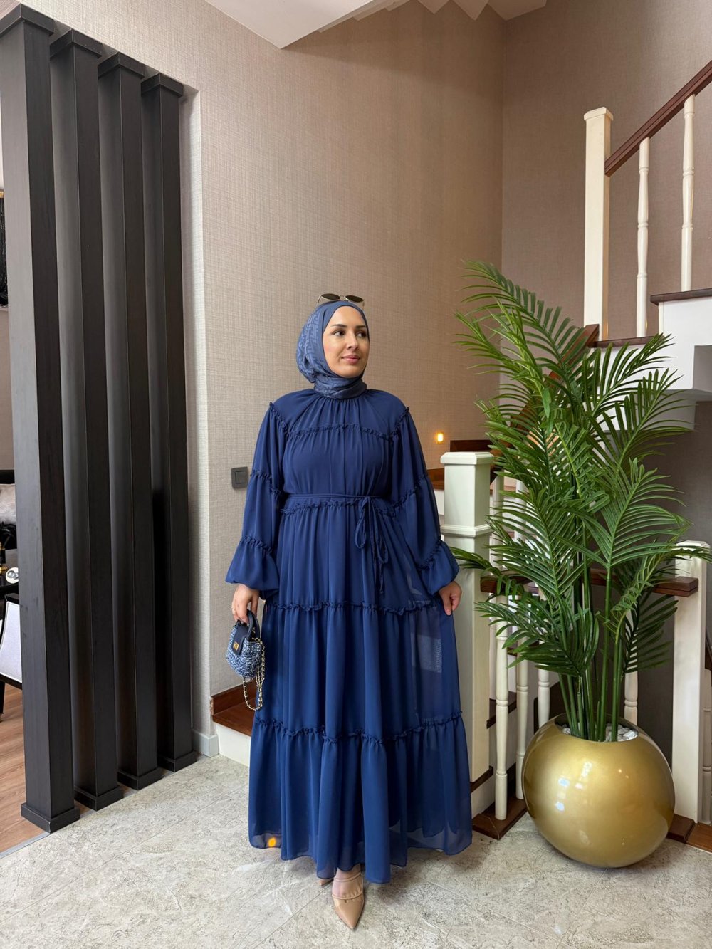 Şifon kumaştır, kat kat detaylara sahiptir. Seyyar kuşağı bulunmaktadır.